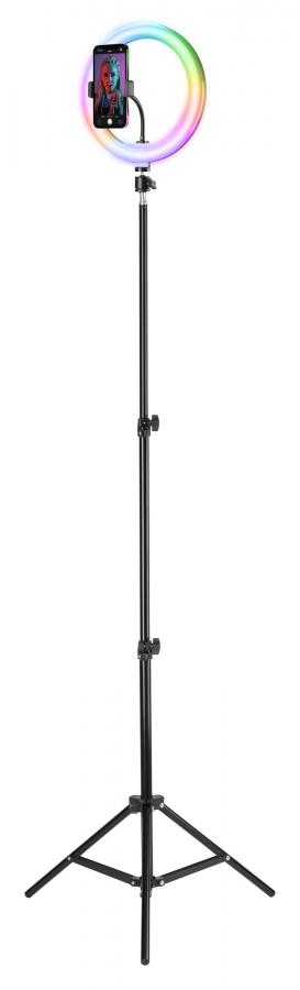 SELFIE RING PRO MULTICOLOR è l'anello led RGB con treppiede estensibile fino a 1.60m di altezza, ideale per riprese video e selfie. L’anello led da 10’’ ha 18 modalità di illuminazione attivabili con telecomando ed è dotato di un supporto universale per smartphone ruotabile per inquadrature a prova di regista! Grazie al telecomando Bluetooth®, incluso in confezione, è possibile scattare selfie o attivare video anche a distanza.