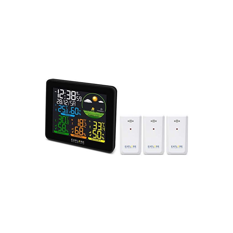 barometro,orologio radiocontrollato doppio allarme con snooze display a colori ,inclusi 3 sensori in confezione black